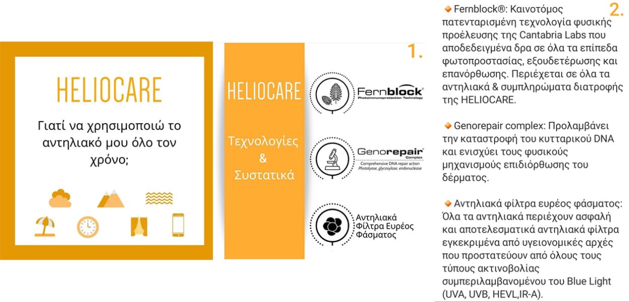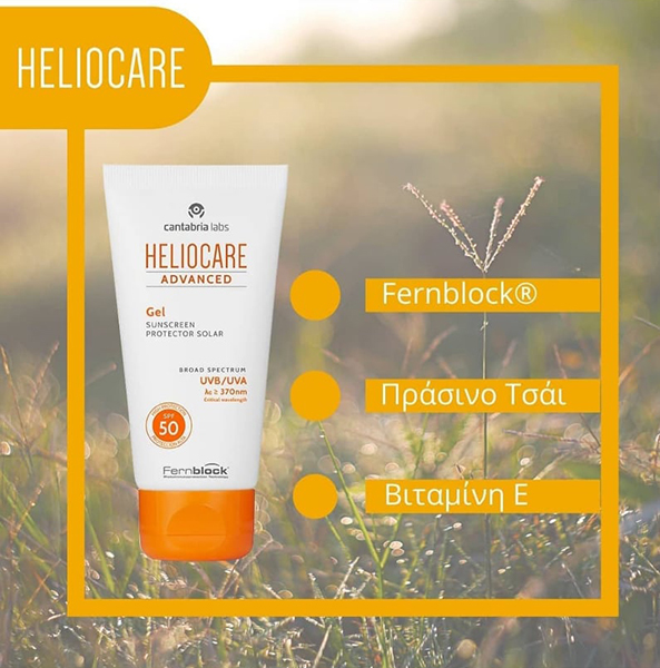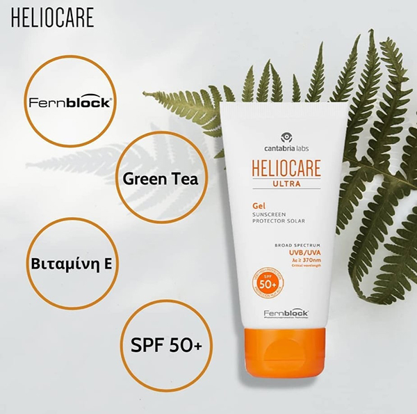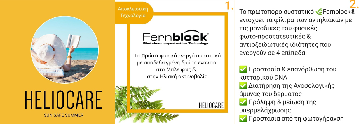 Προηγμένα αντηλιακά –HELIOCARE- που προσφέρουν την καλύτερη δυνατή κάλυψη κατά των ακτίνων UV,χάρη στην φωτο-ανοσοπροστατευτική τεχνολογία Fernblock! Το Fernblock είναι το εκχύλισμα μιας ποικιλίας φτέρης που φύεται στην Κεντρική Αμερική και είναι το συστατικό με τις μοναδικές φυσικές φωτοπροστατευτικές ιδιότητες, που ξεπερνούν την απλή προστασία από τα εγκαύματα. Λειτουργεί σε 4 επίπεδα: